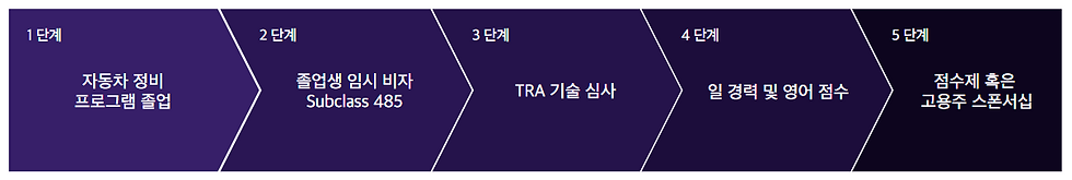 아래 표는 호주 자동차 정비 코스를 통해 호주로 이민하기위한 일반적인 절차에 대한 개요를 제공하며, 호주 이민시 고려할 수 있는 비자 옵션 및 관련 직업군을 소개합니다.