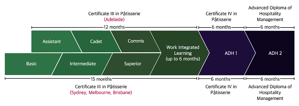 Certificate III in Pâtisserie Work Integrated Learning (WIL) | The Work Integrated Learning (WIL) placement is supported by a dedicated Industry Engagement team, providing you the opportunity to gain industry work experience through our exclusive partnerships. The WIL placement runs for up to 6 months. (600 hours) |